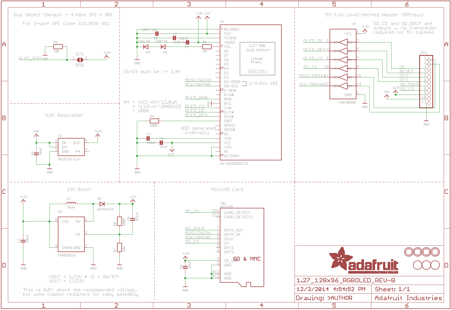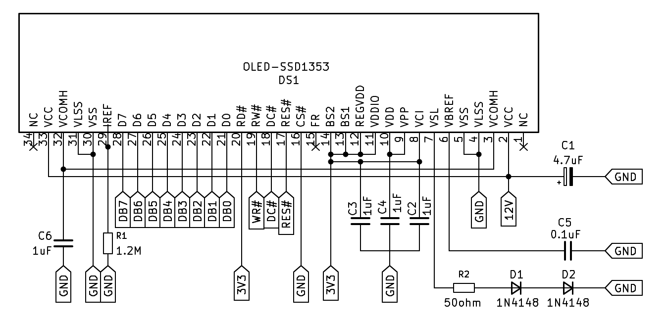 A continuación se muestra el circuito mínimo para hacer funcionar controlador SSD1353, y hay un par de puntos que quiero aclarar; Primero, usa dos voltajes de alimentación que son 3.3V para el controlador y 12V para los pixeles donde este último se logra con un boost. Segundo, se pueden usar otro tipo de condensadores además de los indicados por el fabricante como ha hecho adafruit con uno de sus productos usando el mismo controlador pero para una pantalla con otras dimensiones.