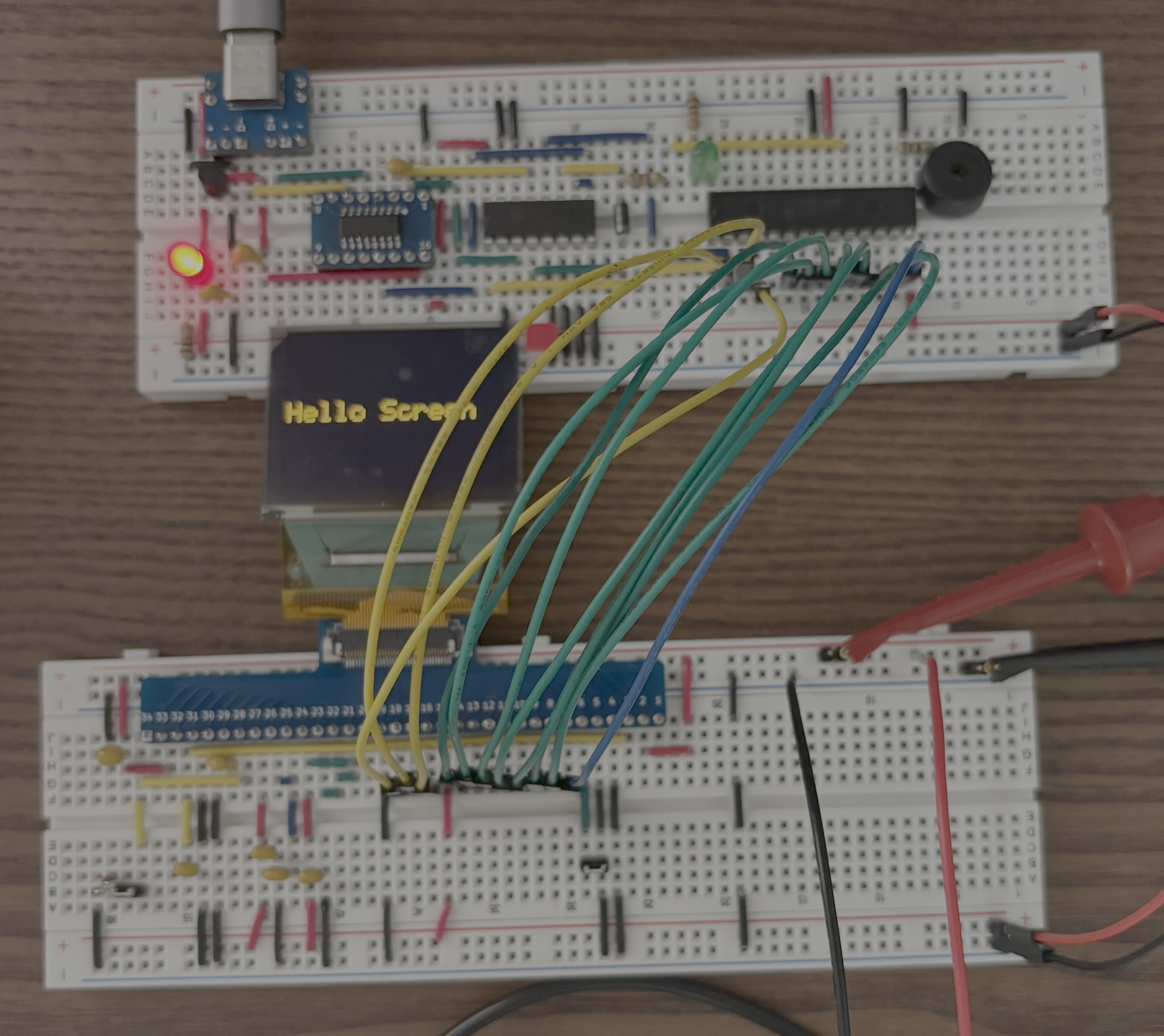 Así quedo luego de armarlo en el breadboard y conectarlo a mi otro circuito que usa un AVR128DA28. No hacer caso al orden numérico de la PCB que usé cómo adaptador para conectar el circuito al flex (FPC). En este punto el circuito no usa los 12V generados por un Boost, sino usé una fuente de alimentación ajustable para probar. Es cierto que la foto no es la mejor.